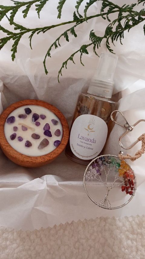 - Vela aromática con lavanda y amatistas: → acompaña el descanso, perfumar el ambiente y generar serenidad y un clima de paz.